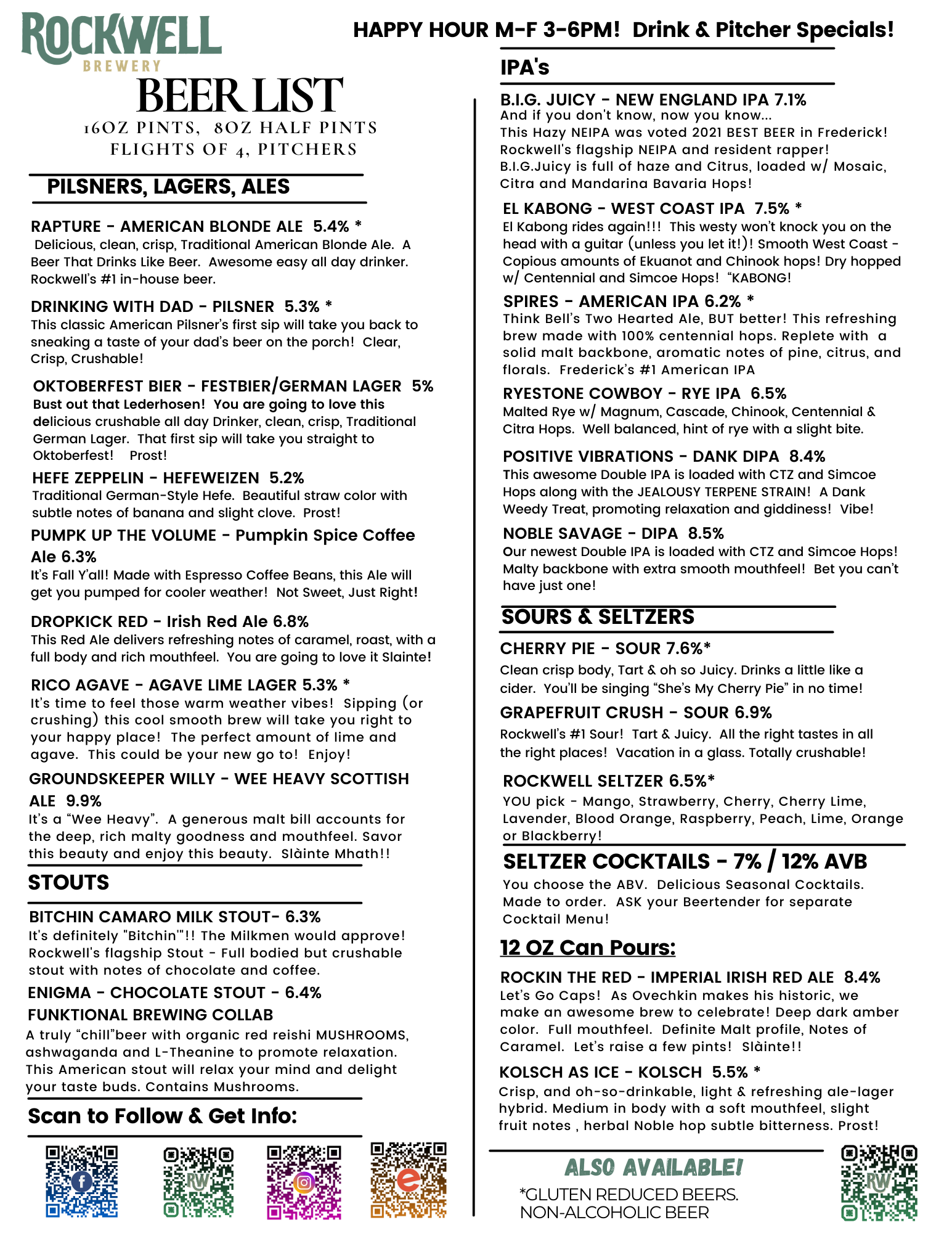 In May 2023, our operation expanded to include our new, upscale, state of the art, Riverside location. Rockwell Riverside is the largest tap room in Frederick, and features 20 taps for specialty brews, a large upscale tap room, and private event space. You can find different musical acts here, events, food trucks, and so much more!